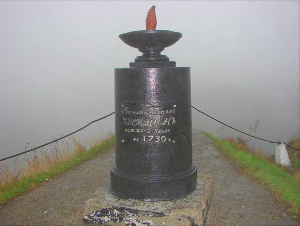 Согласно легенде, Степан Чумпин был сожжён своими соплеменниками за то, что выдал казённым людям тайну горы[13][6][15][16]. В память об этом на вершине горы в 1826 (по другим данным, в 1830[17]) году был поставлен памятник[12]. Однако документально версия о том, что Чумпина действительно сожгли, не подтверждена[8][18].