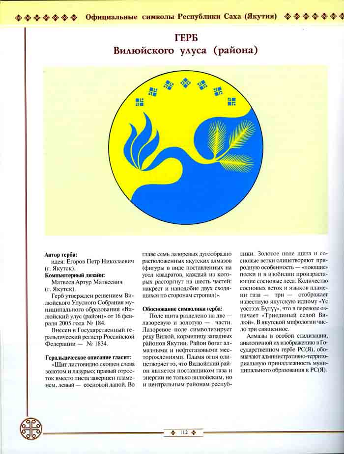 - ↑ 1 2 Решение Вилюйского улусного Собрания муниципального образования «Вилюйский улус (район)» № 184 от 16 февраля 2005 года о гербе района