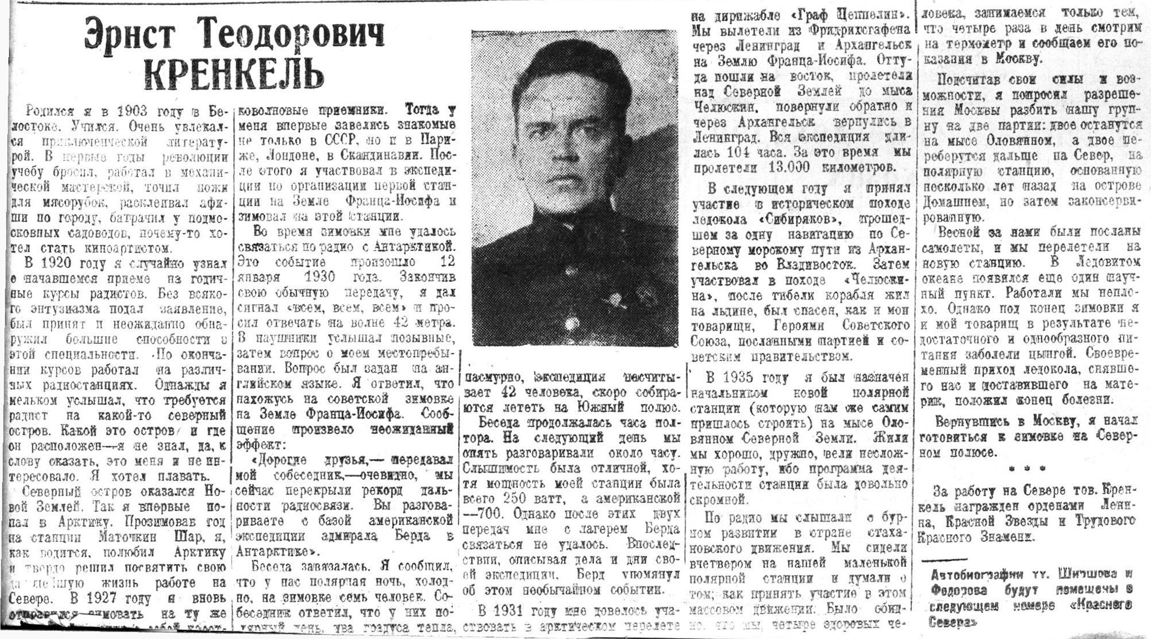 - ↑ Кренкель Э. На островах Сергея Каменева // Правда. — 1936, 31 марта. — № 90. — С. 3.