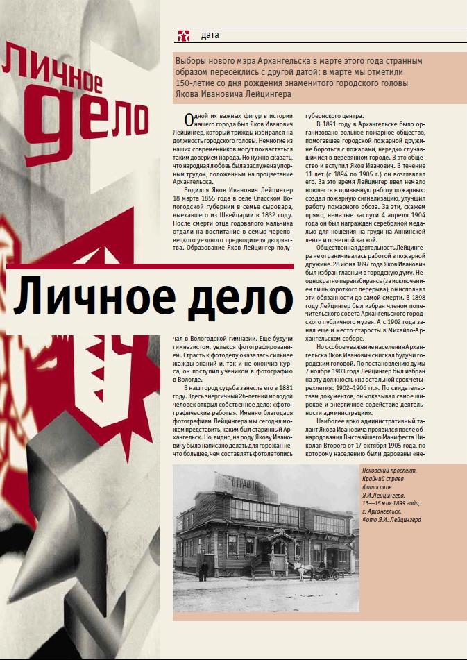- Тараканов Константин. Из фотографа в мэры. 11 лет Яков Лейцингер возглавлял Архангельск. // Аргументы и факты : газета. — 2014.