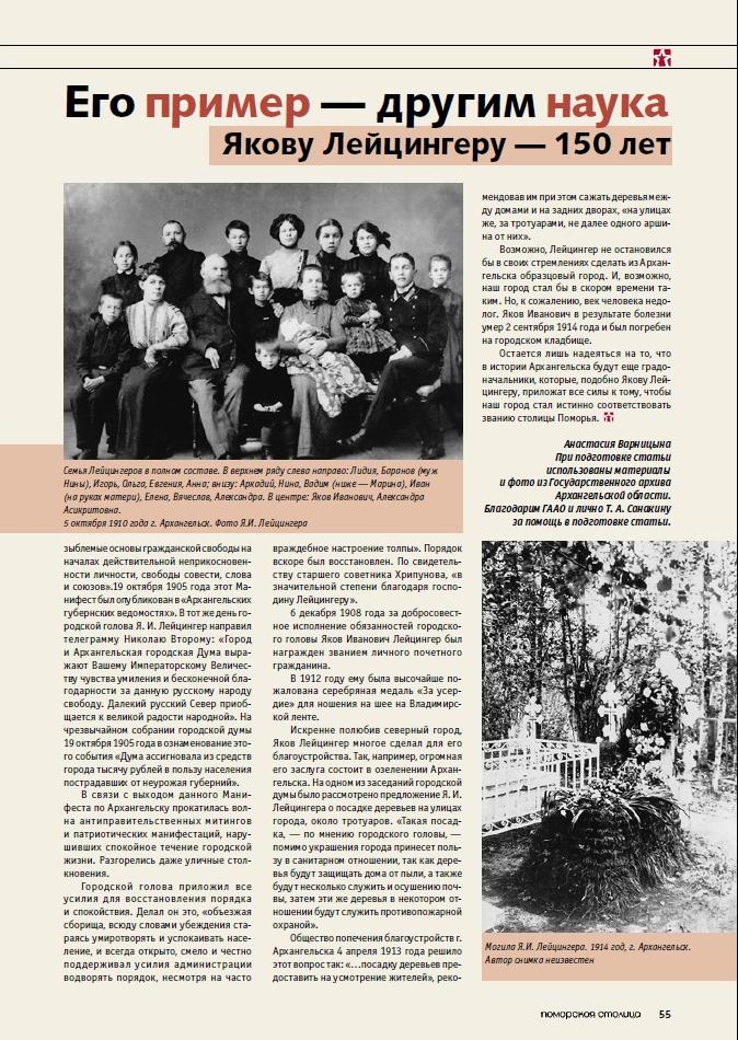 - Варницына Анастасия. Его пример — другим наука. Якову Лейцингеру — 150 лет. // Поморская столица : журнал. — 2005. — № 4. — С. 54—55. [1] [2]