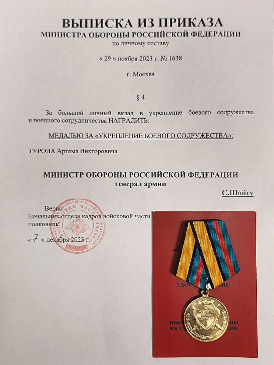 - ↑ Приказ МО РФ от 29 ноября 2023 г. № 1638 о награждении Турова А.В. медалью «За укрепление боевого содружества». Дата обращения: 24 августа 2024. Архивировано 24 августа 2024 года.