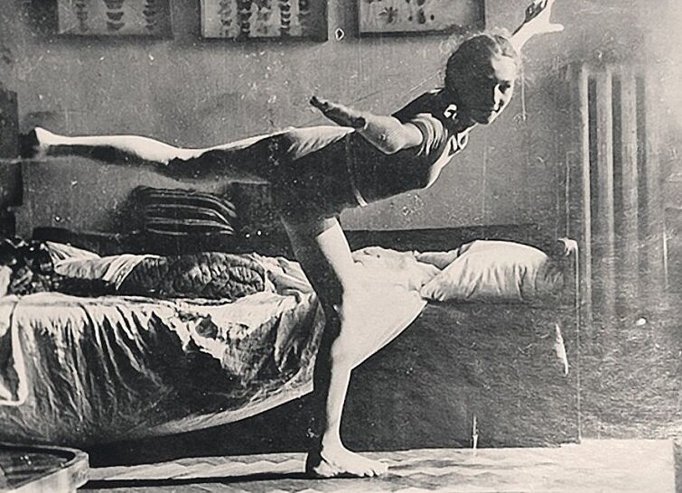 «Меня только что приняли в пионеры, я просто летала. Сама вскакивала поутру с первыми лучами солнца и жмурилась, ощущая, как нагрело весеннее солнце пол. И мама поймала это ощущение тёплого со сна ребёнка… Я занималась балетом и гимнастикой, и то, как на картине в сторону отставлена ножка и вскинуты руки, — это часть хореографии, эти движения мама и подметила… Картина очень натуралистична»