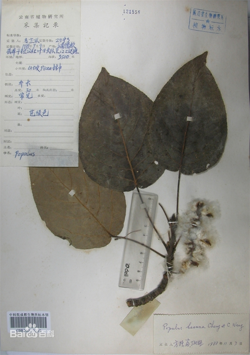 Populus haoana W.C.Cheng & C.Wang[вд], Bulletin of Botanical Laboratory of North-Eastern Forestry Institute[исп.] 4: 17–19, t. 1 (1979)